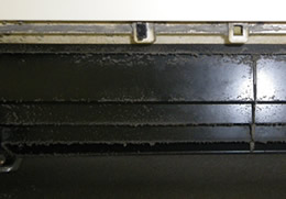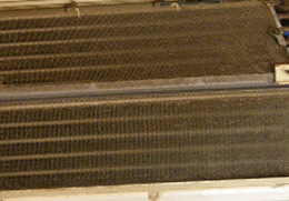 ホコリとヤニとカビで熱交換器が目詰まりしています。こうなると熱交換率が悪くなり、冷暖房の効きが悪くなり余計な電気代がかかってしまいます。